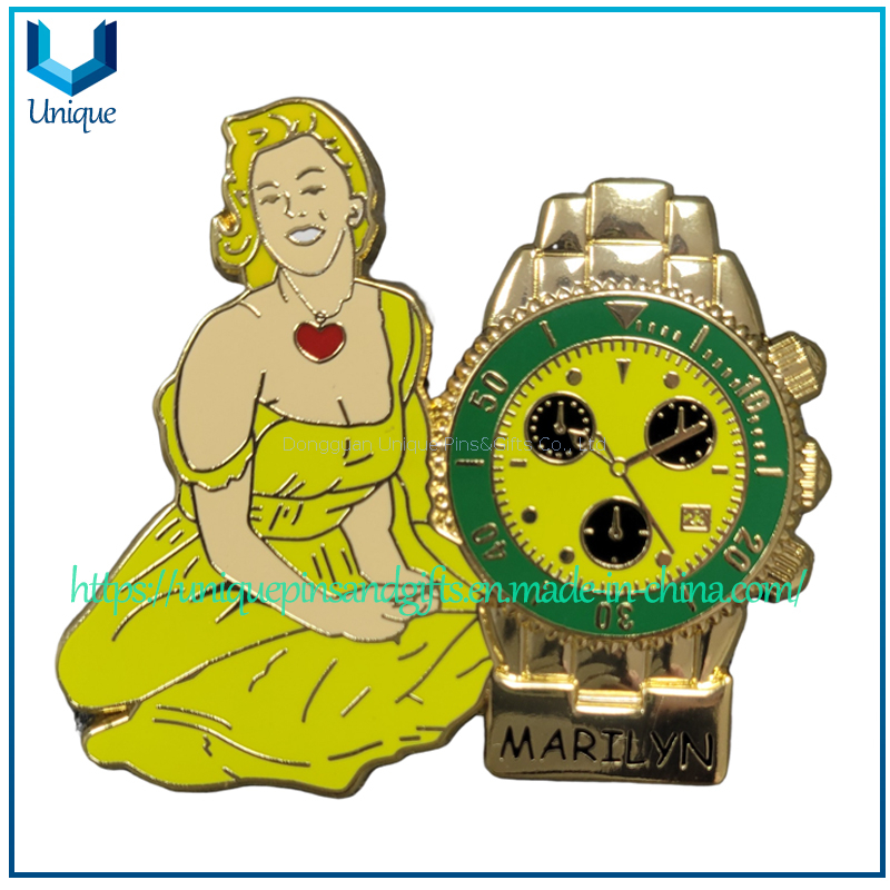 | Artículo | China Pin Manufactuere Pin's Creation Custom Marylin Fancy Fashion Pin con reloj 3D en esmalte duro en colores surtidos | |||
